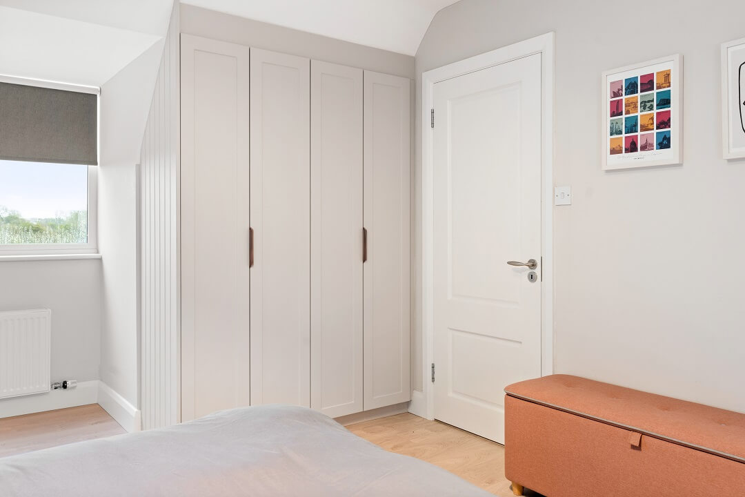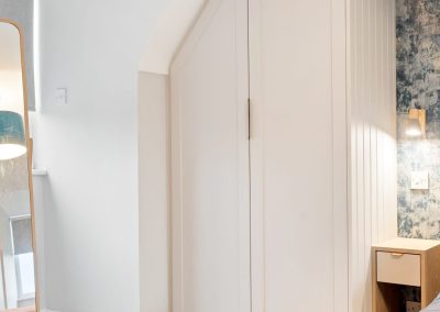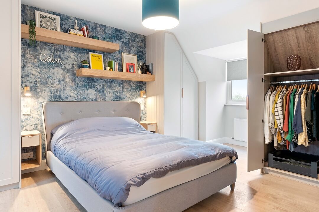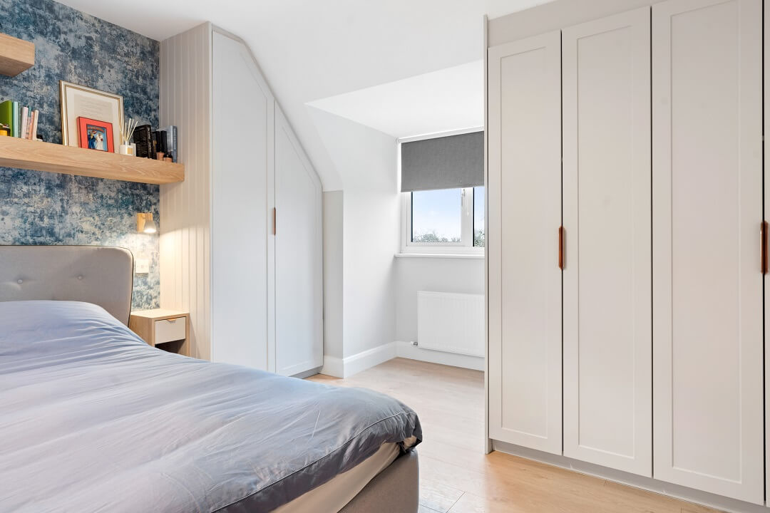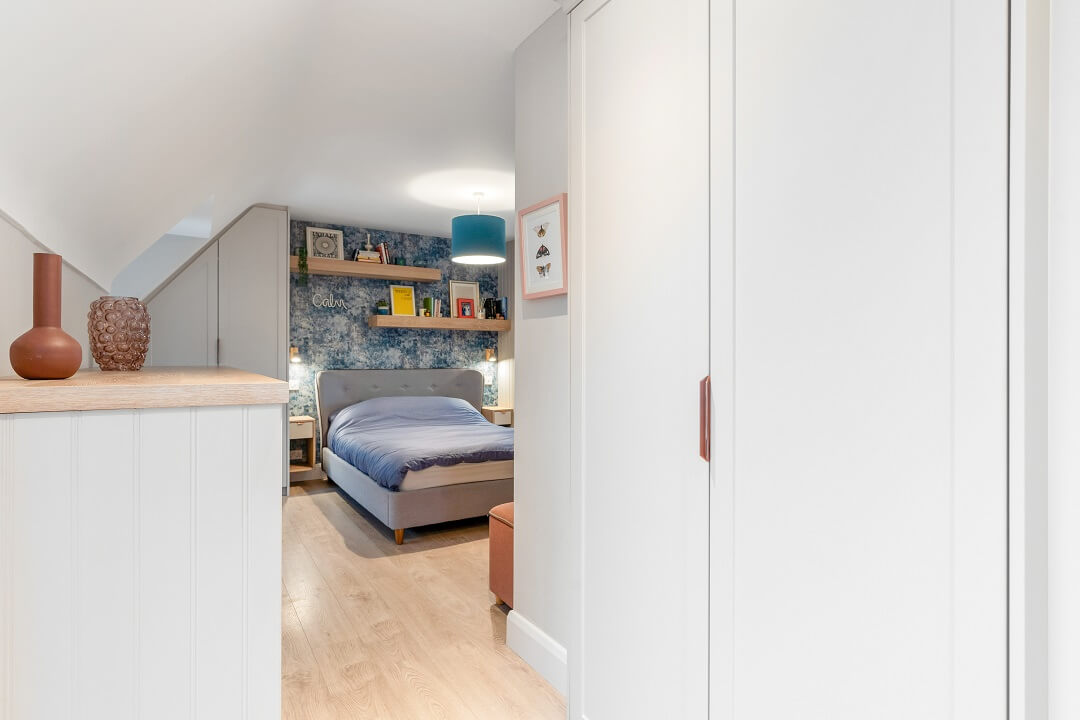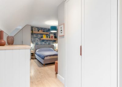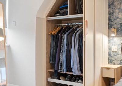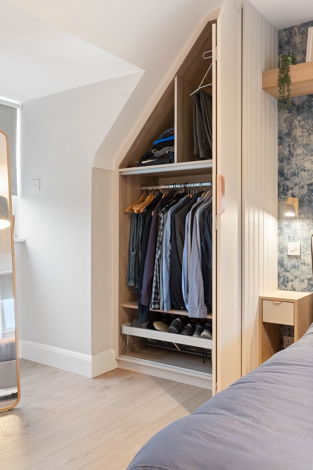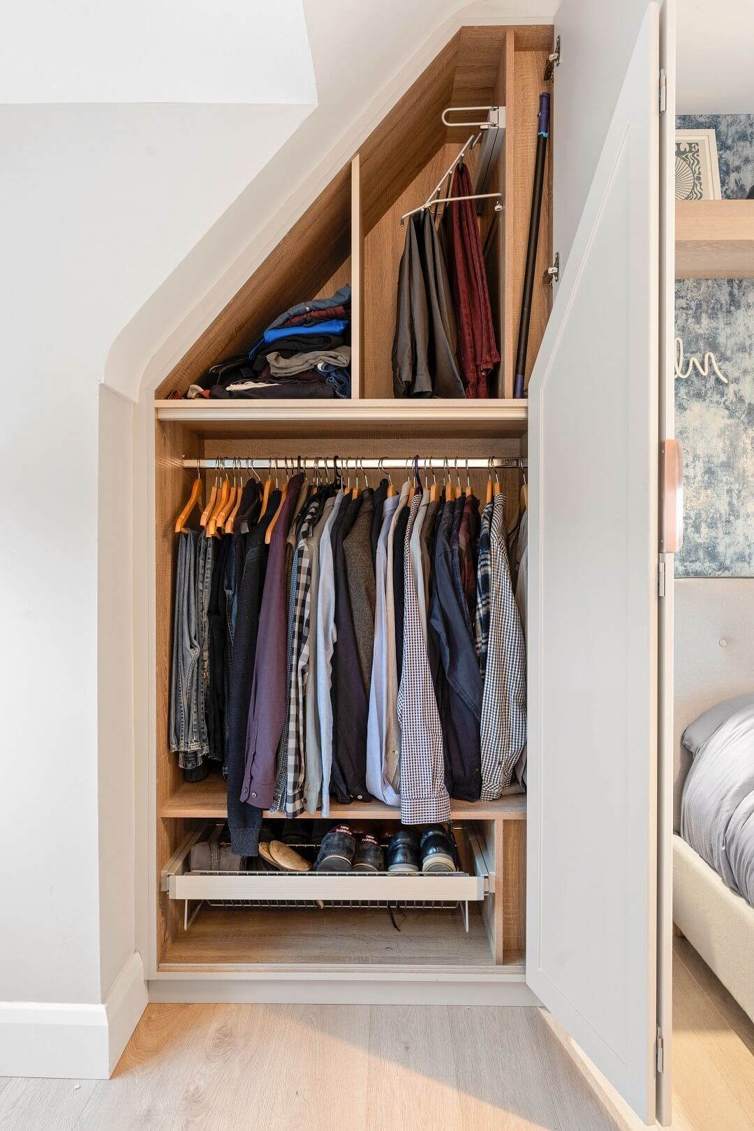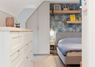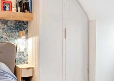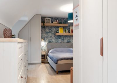 We love these angular wardrobes and many other clients have used them since to fill awkward spaces. The capacity in this space has increased exponentially after an influx of our smart storage solutions and space-savers.