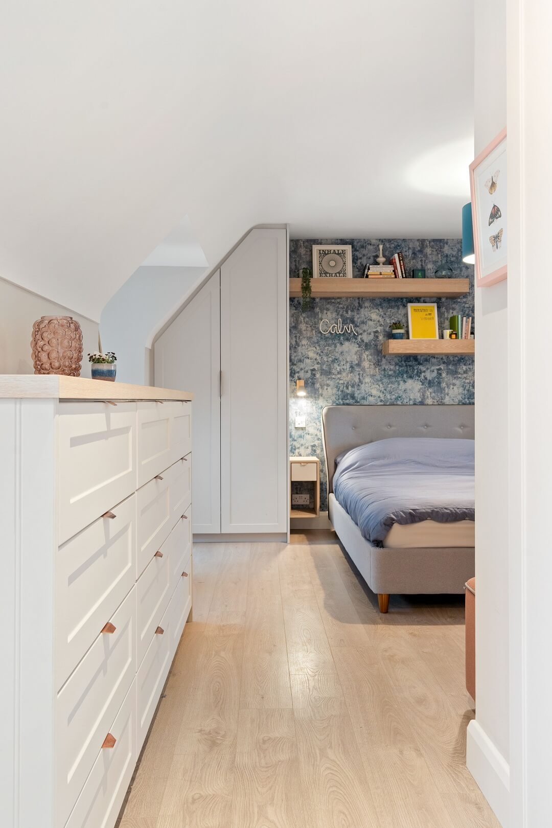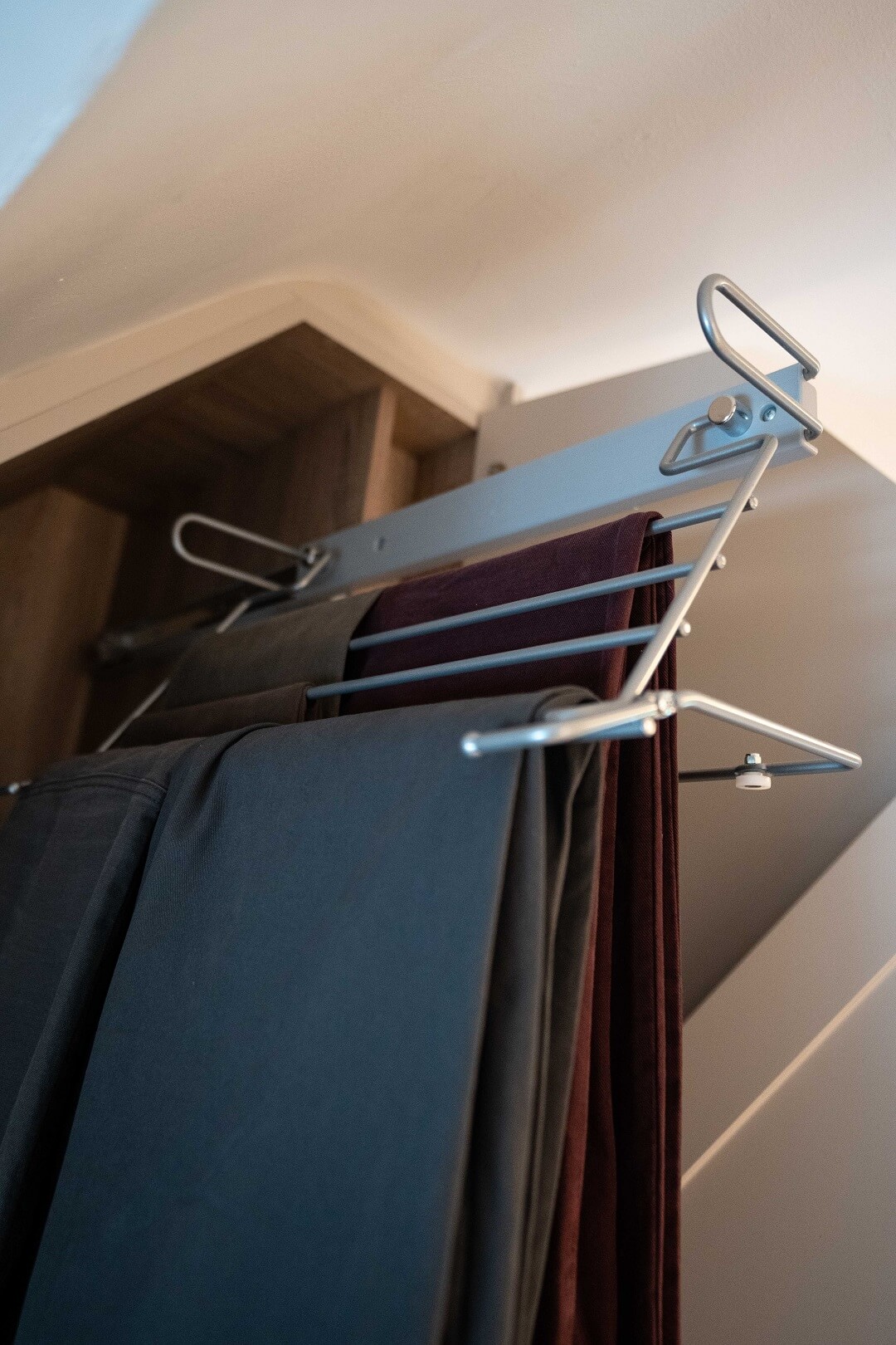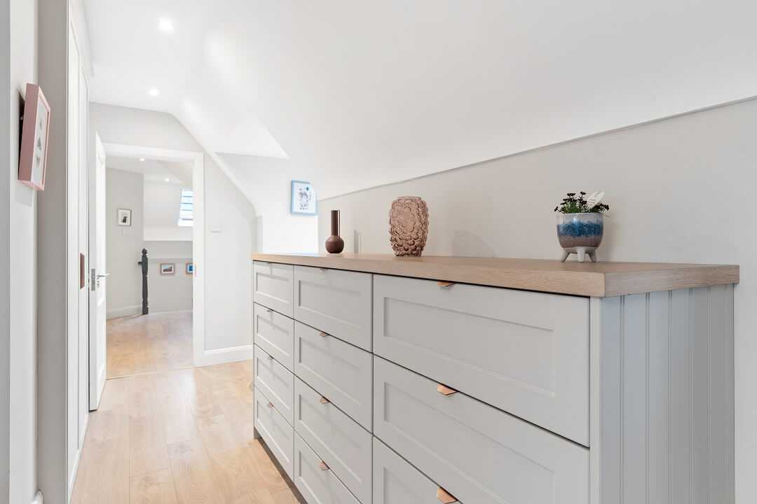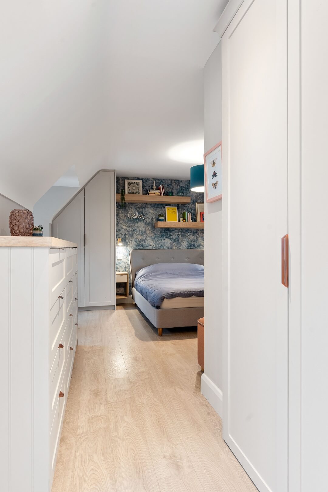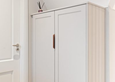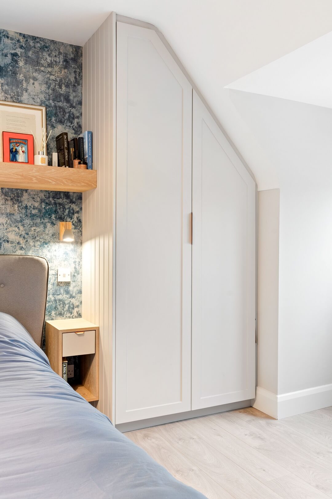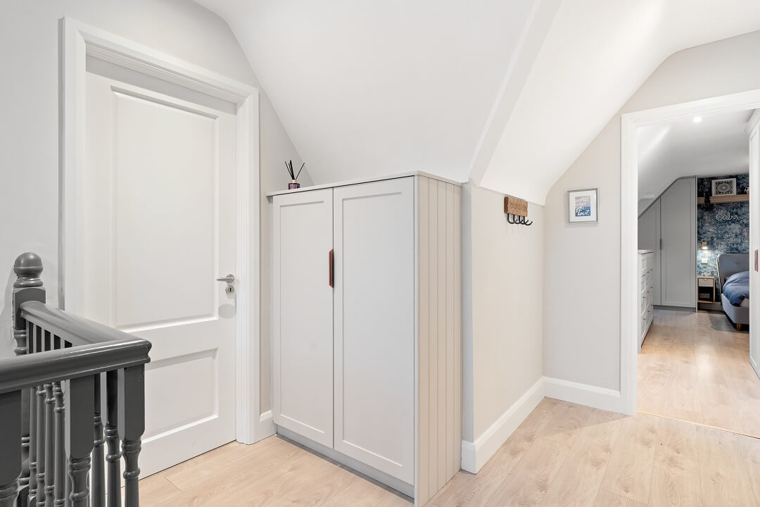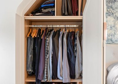 We love these angular wardrobes and many other clients have used them since to fill awkward spaces. The capacity in this space has increased exponentially after an influx of our smart storage solutions and space-savers.