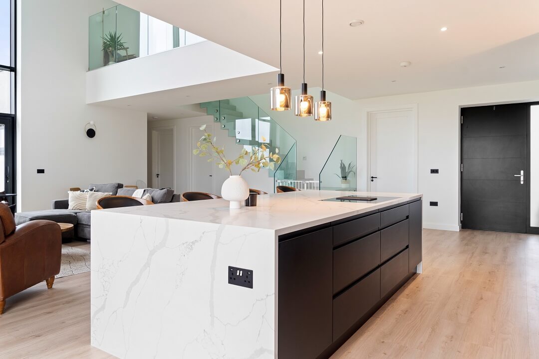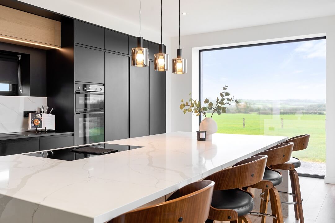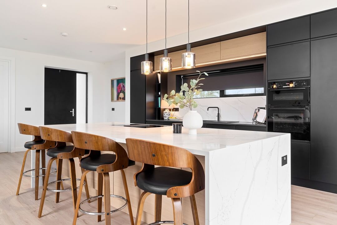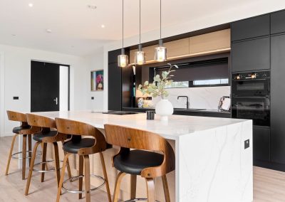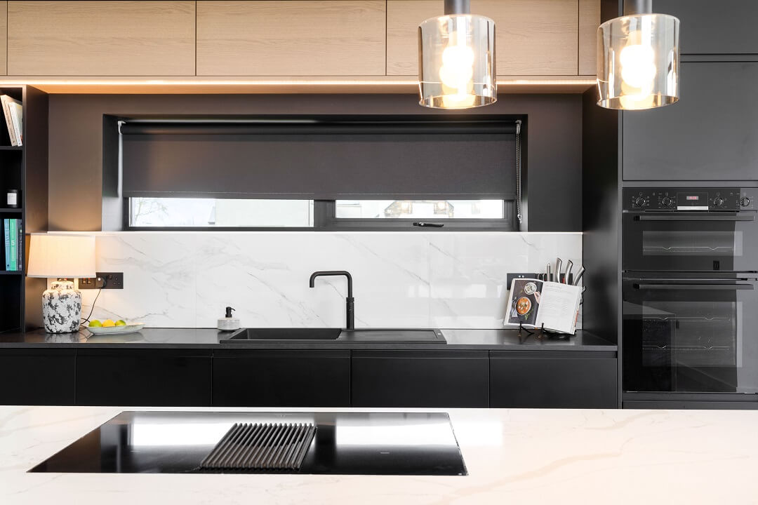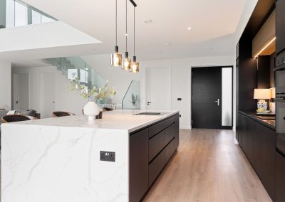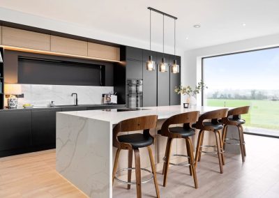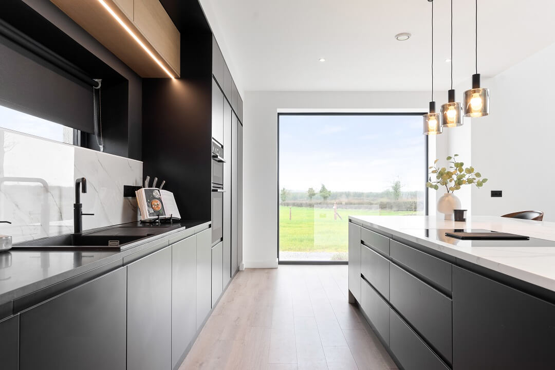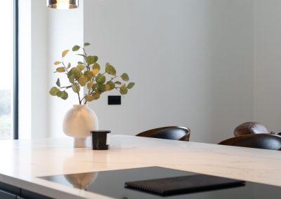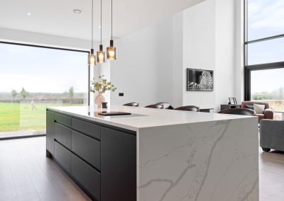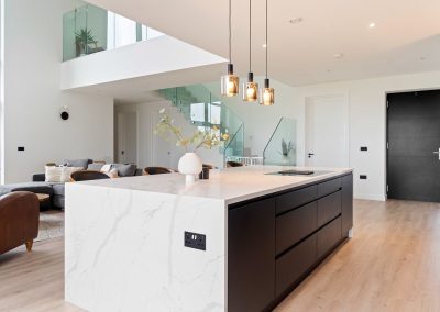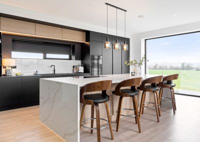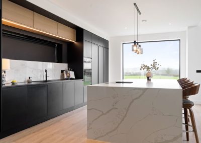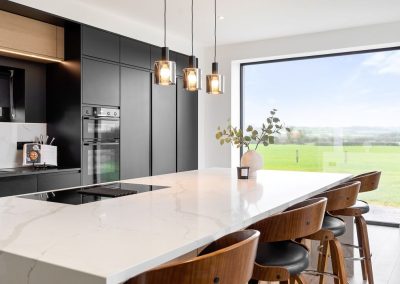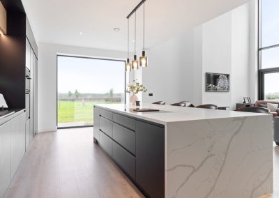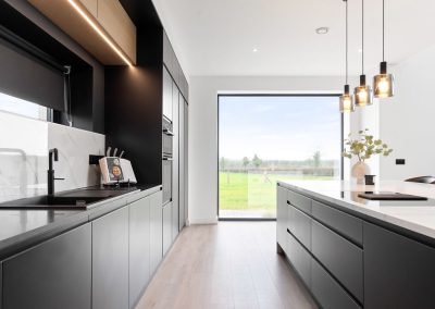 Here we had a young couple moving home from the west coast of the USA to build a home for their family. The design featured flat roofs, large picture windows throughout and a huge open-plan feel. The whole concept was truly stunning on paper and the kitchen, being one of the focal points of the whole build, needed to follow suit. Our clients came to us with plenty of ideas and examples they’d gathered and we really enjoyed the design stage of this project. The results speak for themselves.