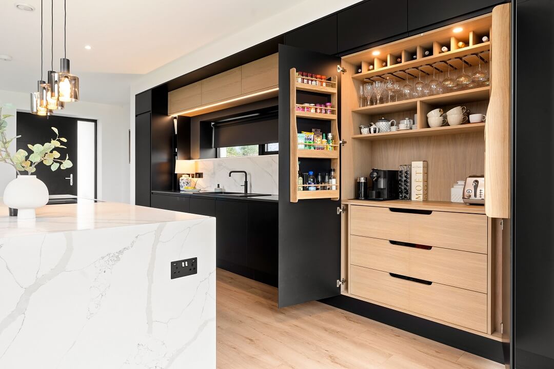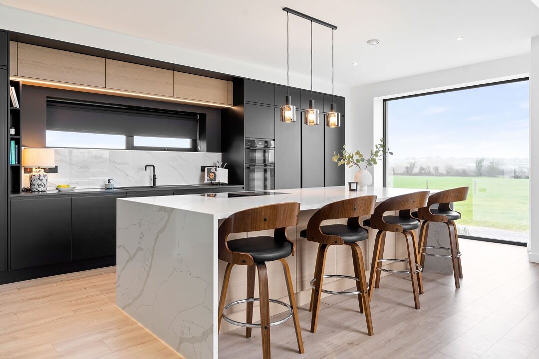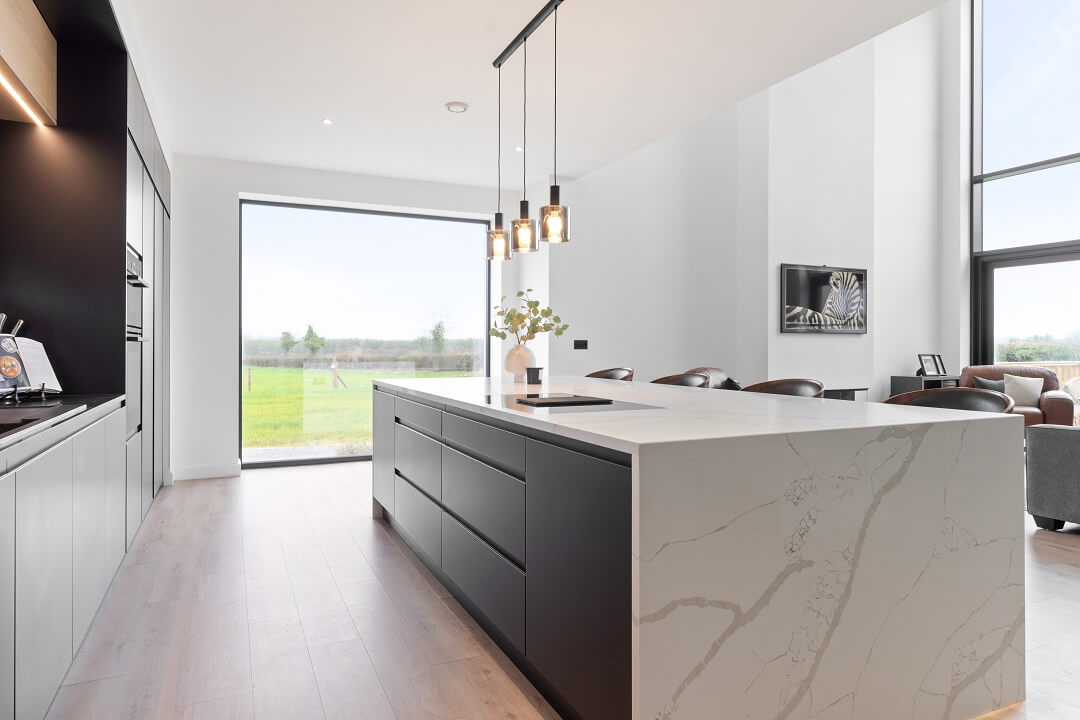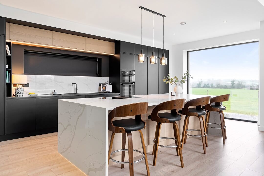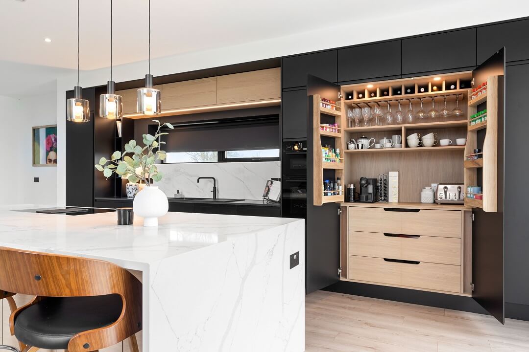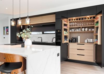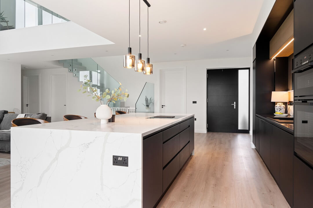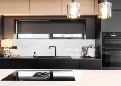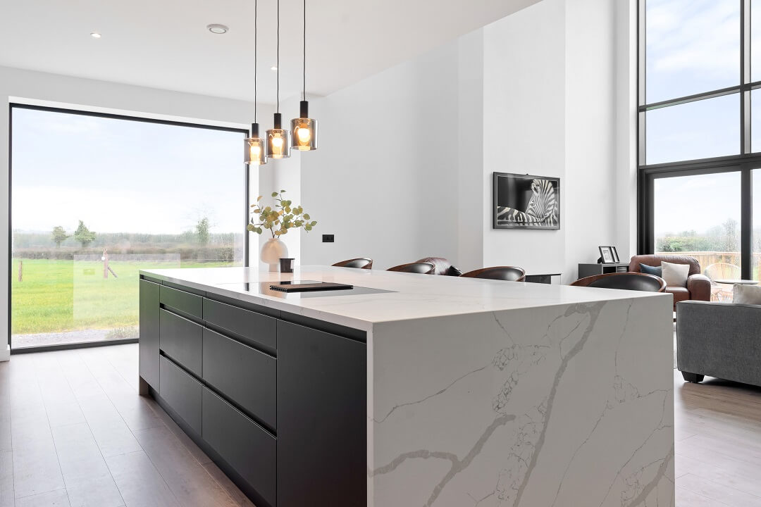 Here we had a young couple moving home from the west coast of the USA to build a home for their family. The design featured flat roofs, large picture windows throughout and a huge open-plan feel. The whole concept was truly stunning on paper and the kitchen, being one of the focal points of the whole build, needed to follow suit. Our clients came to us with plenty of ideas and examples they’d gathered and we really enjoyed the design stage of this project. The results speak for themselves.