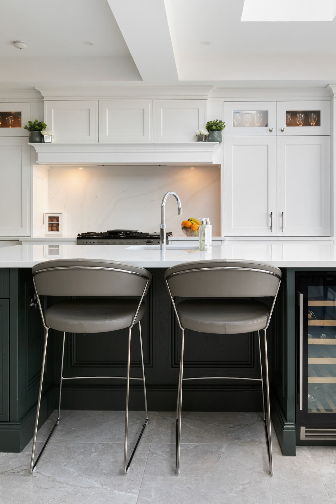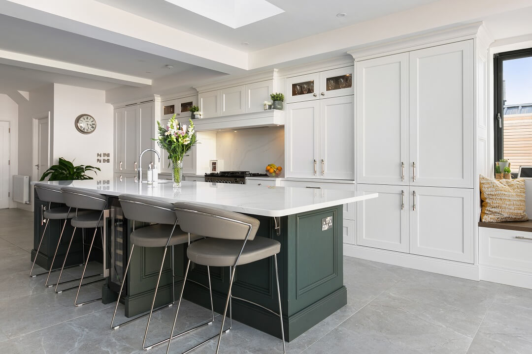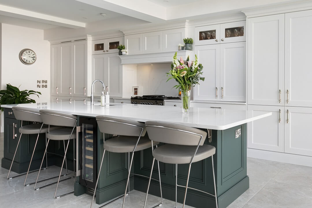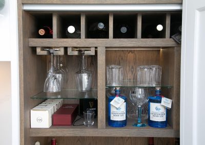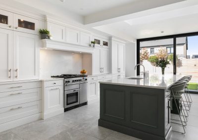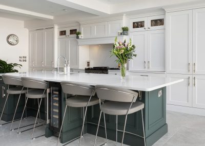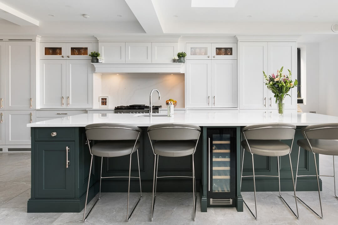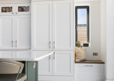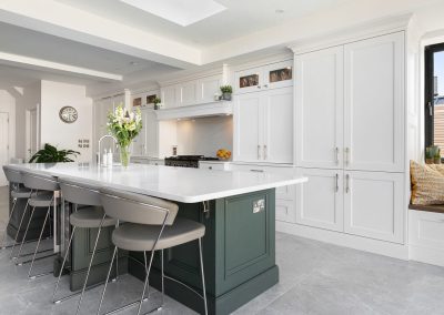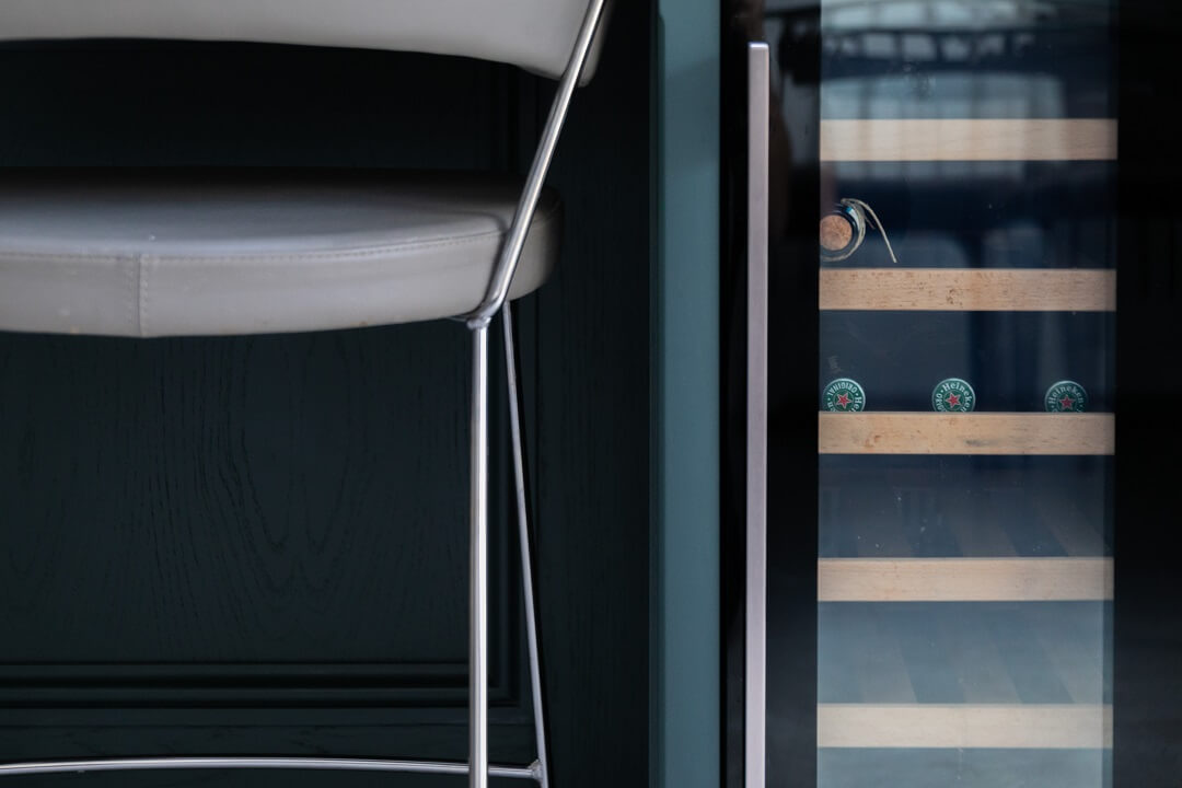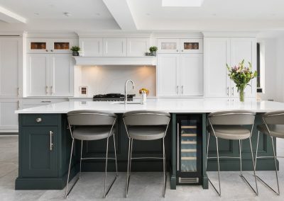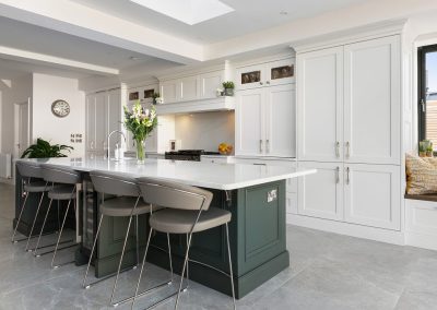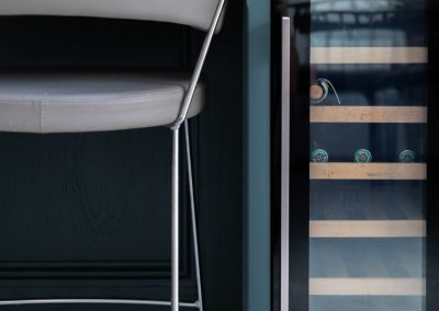 This projected married functionality, innovation and style. Light floods this space during the day and the deep green island amplifies the lighter colours elsewhere. We love the wine cooler and drinks area – essentials!