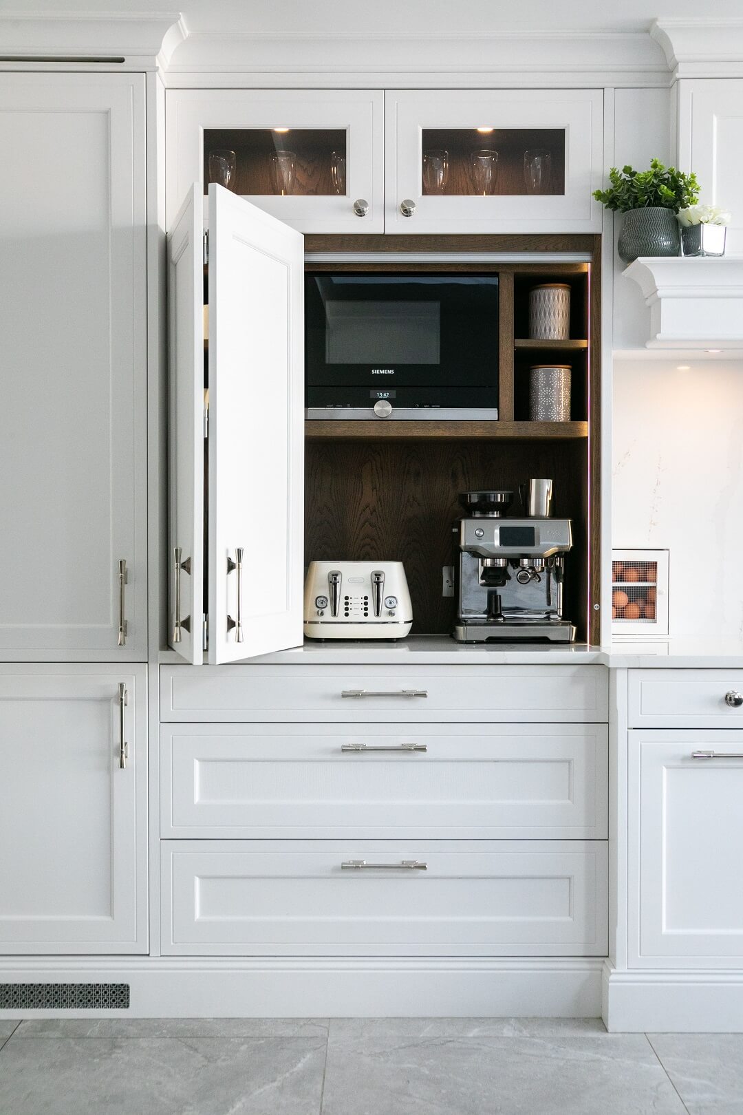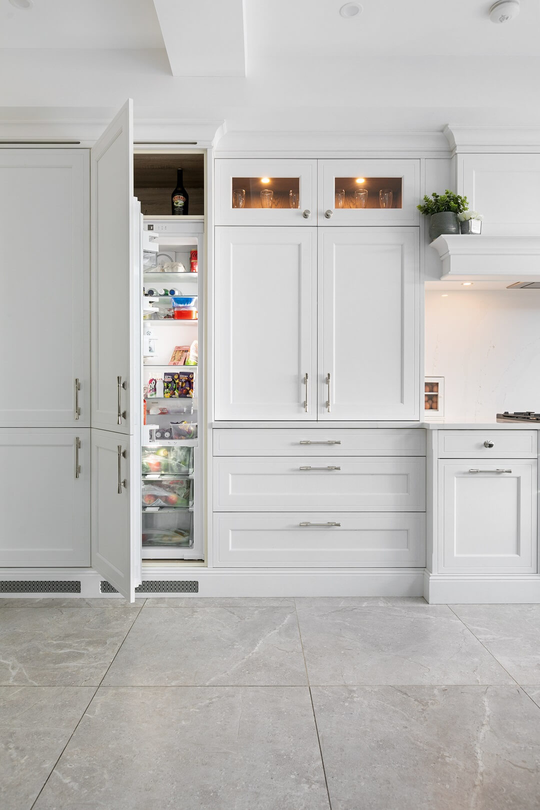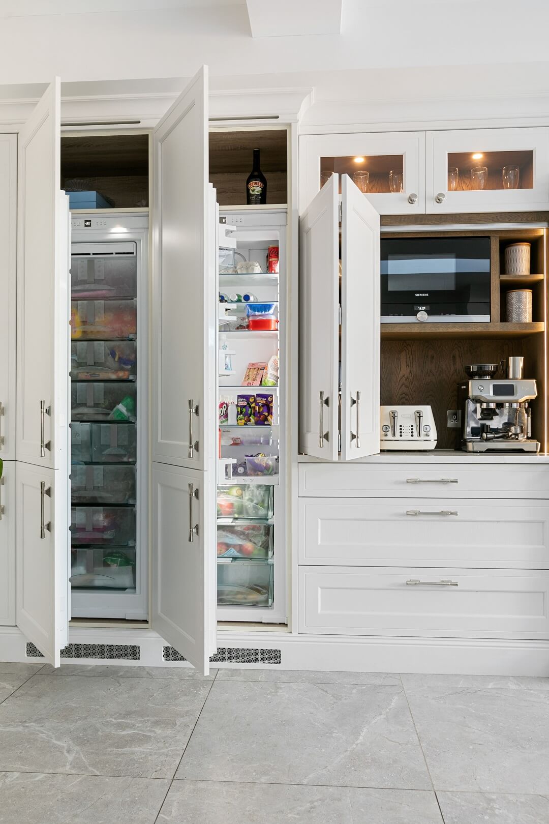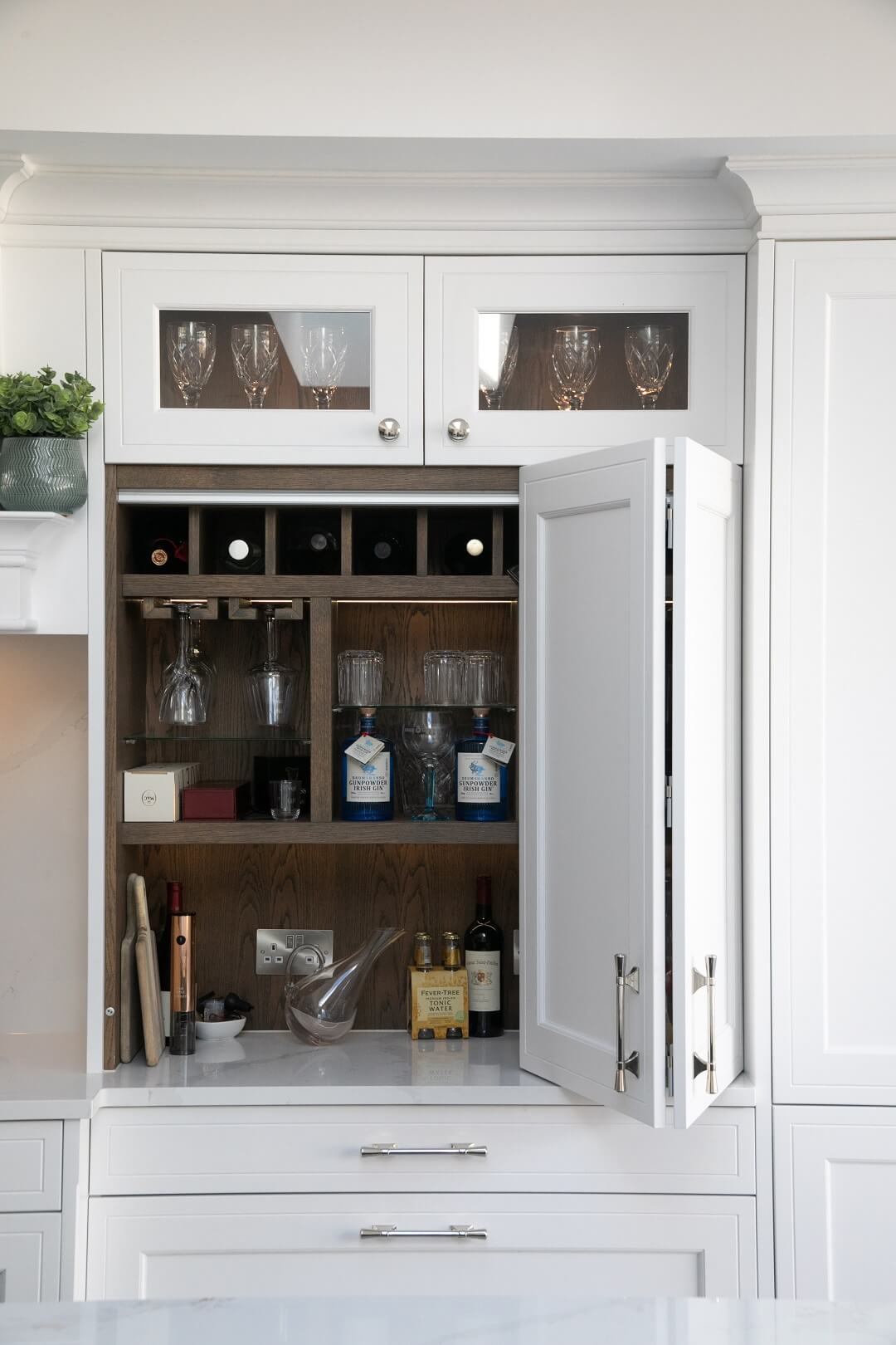 This projected married functionality, innovation and style. Light floods this space during the day and the deep green island amplifies the lighter colours elsewhere. We love the wine cooler and drinks area – essentials!