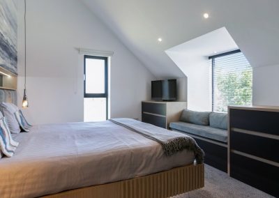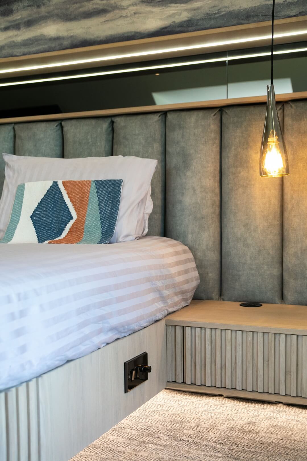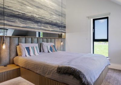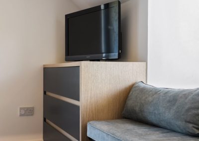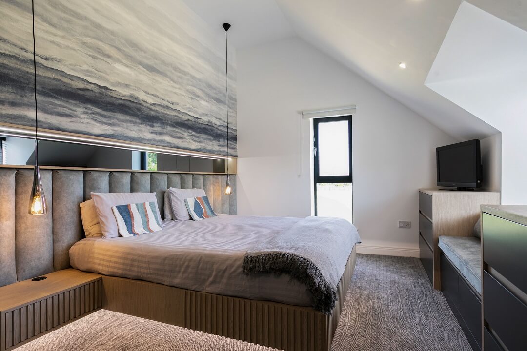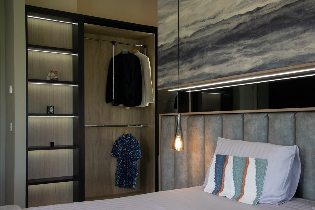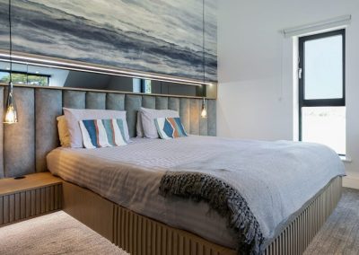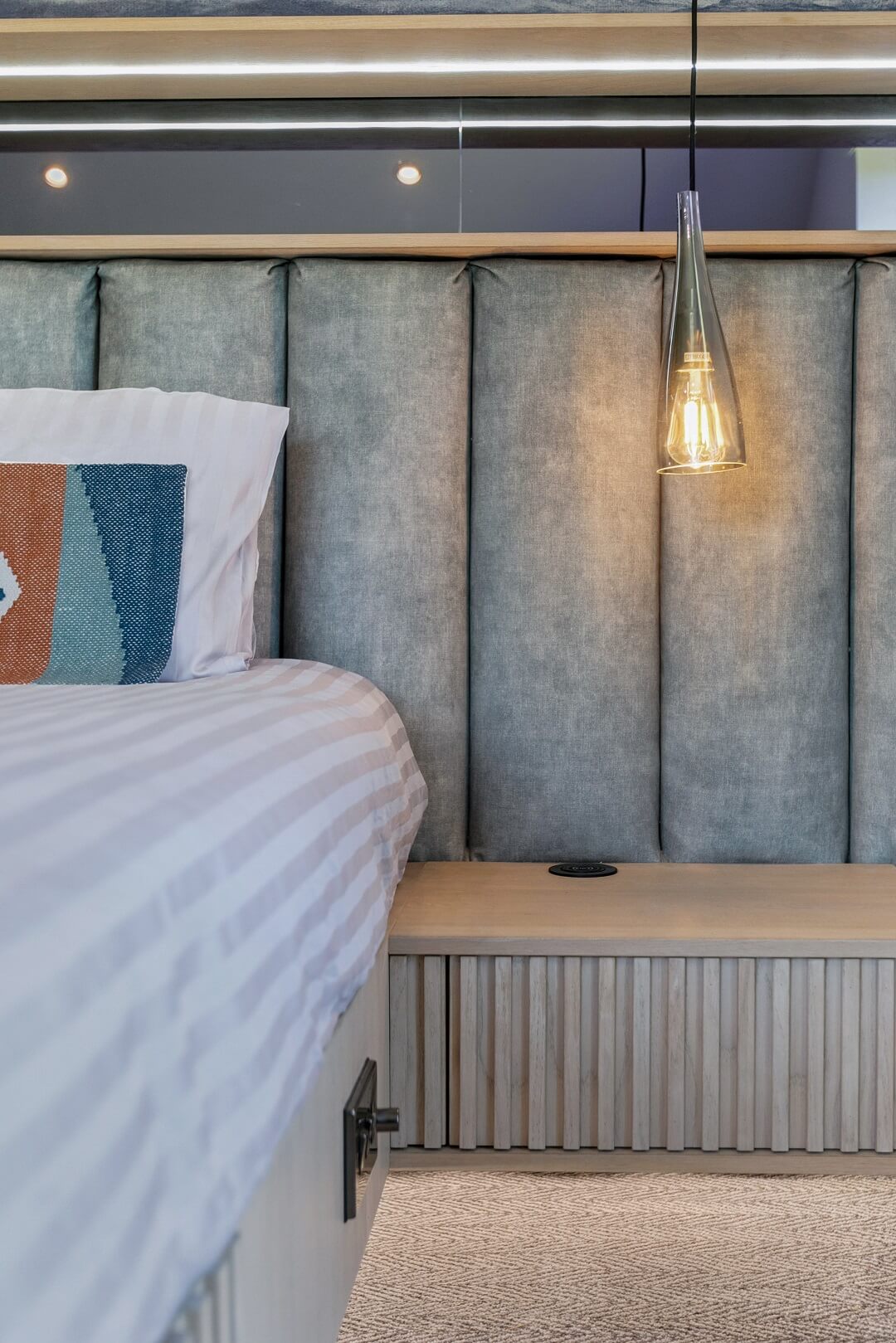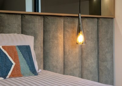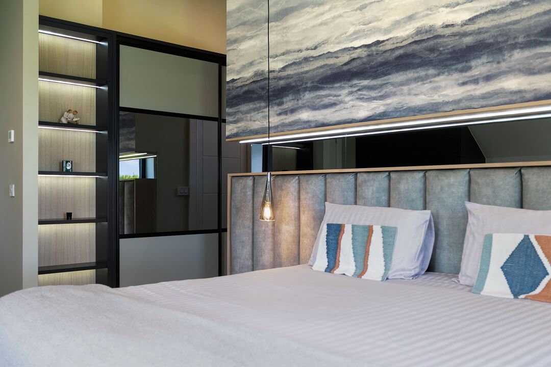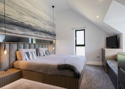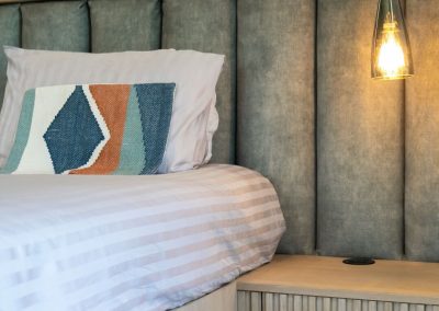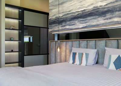 This is one of the most modern bedroom finishes we have produced. The space is complete with floating bed, wireless charging points, storage solutions, wall mirror, hanging lamps and man-friendly compartmented drawer.