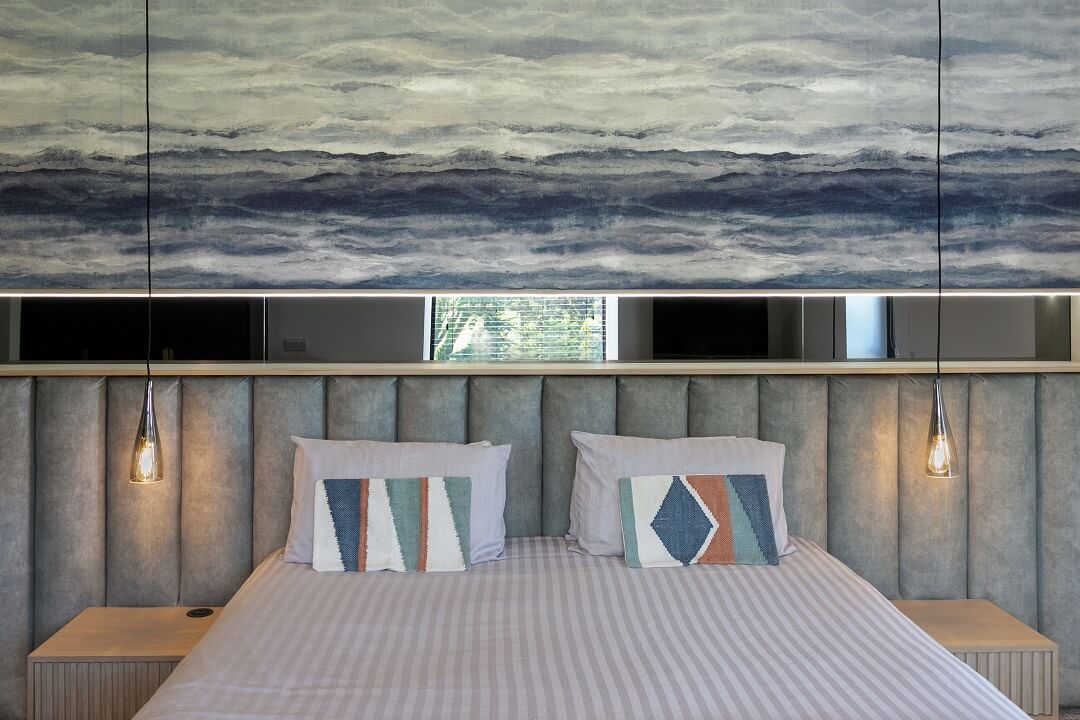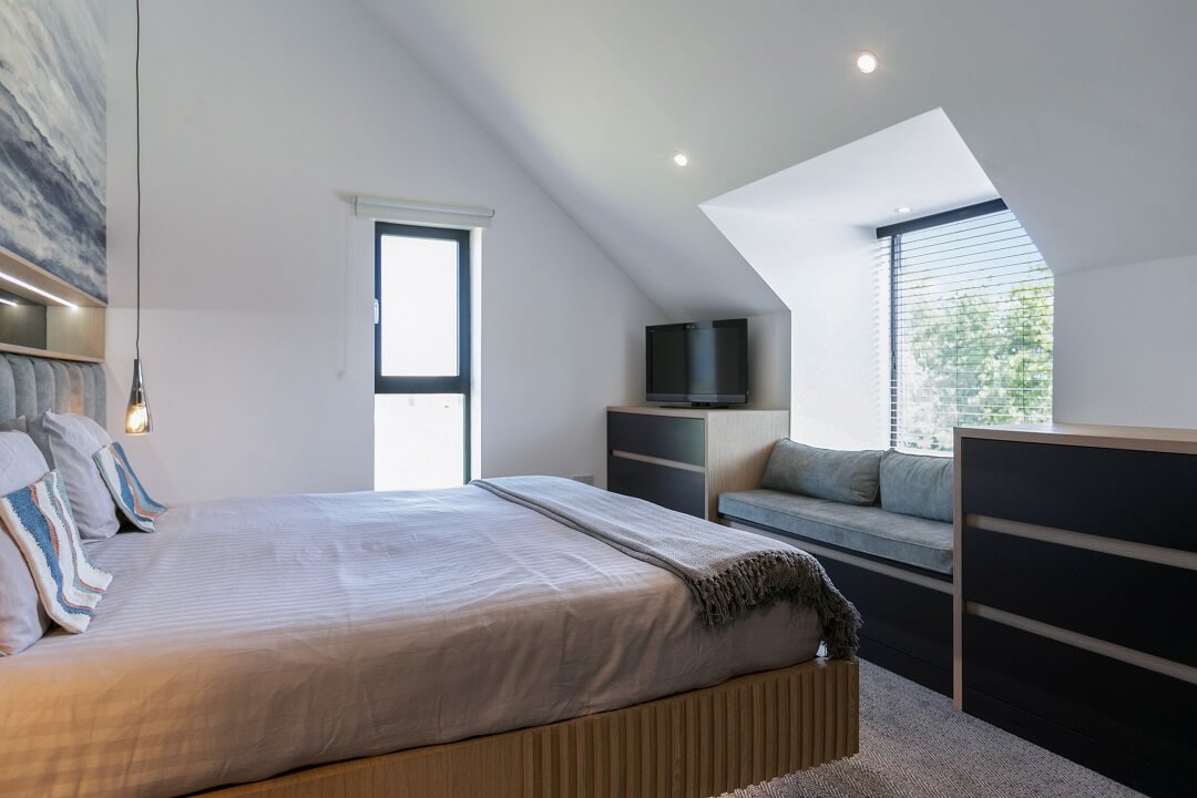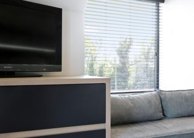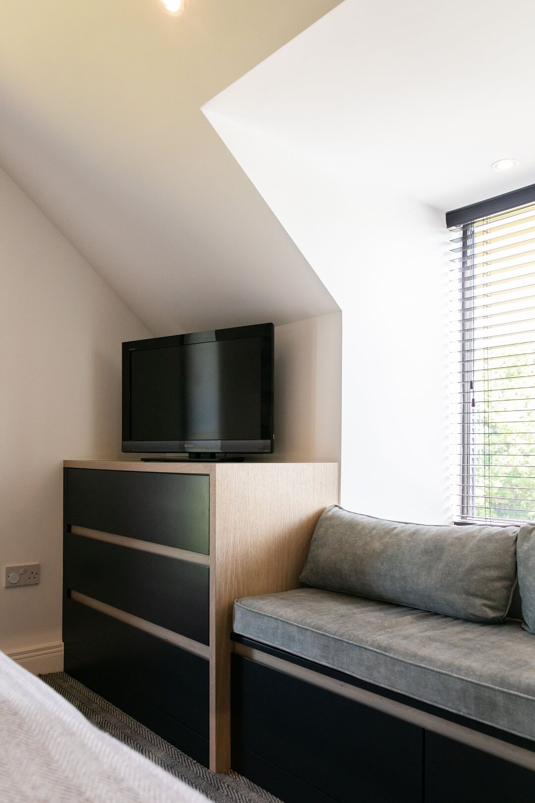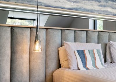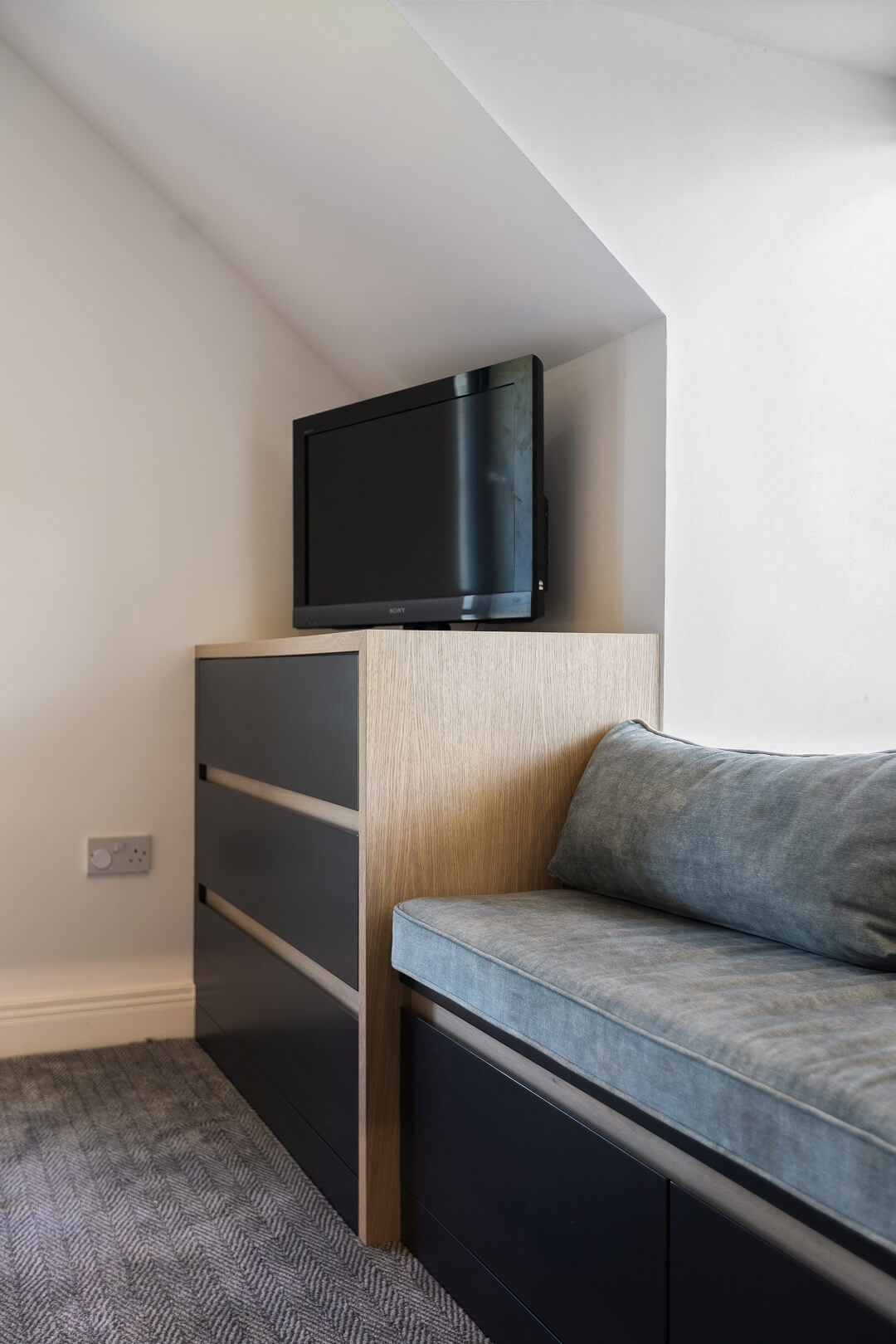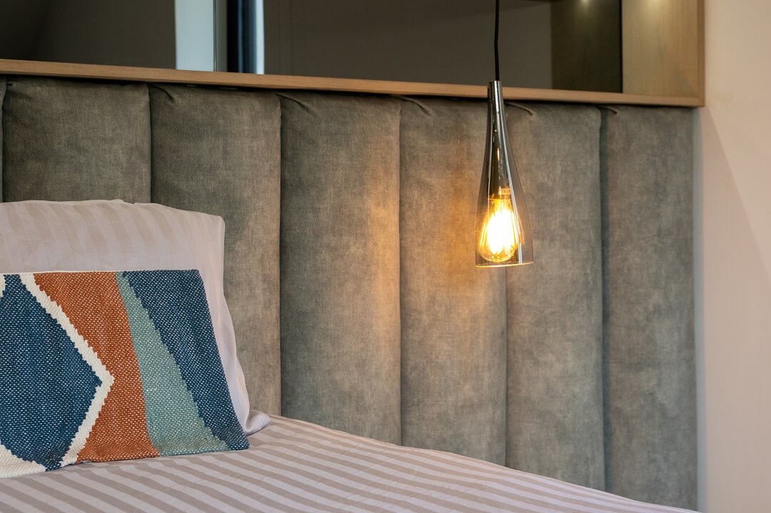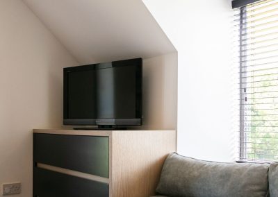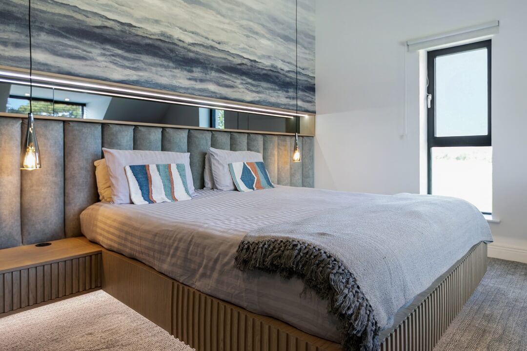 This is one of the most modern bedroom finishes we have produced. The space is complete with floating bed, wireless charging points, storage solutions, wall mirror, hanging lamps and man-friendly compartmented drawer.